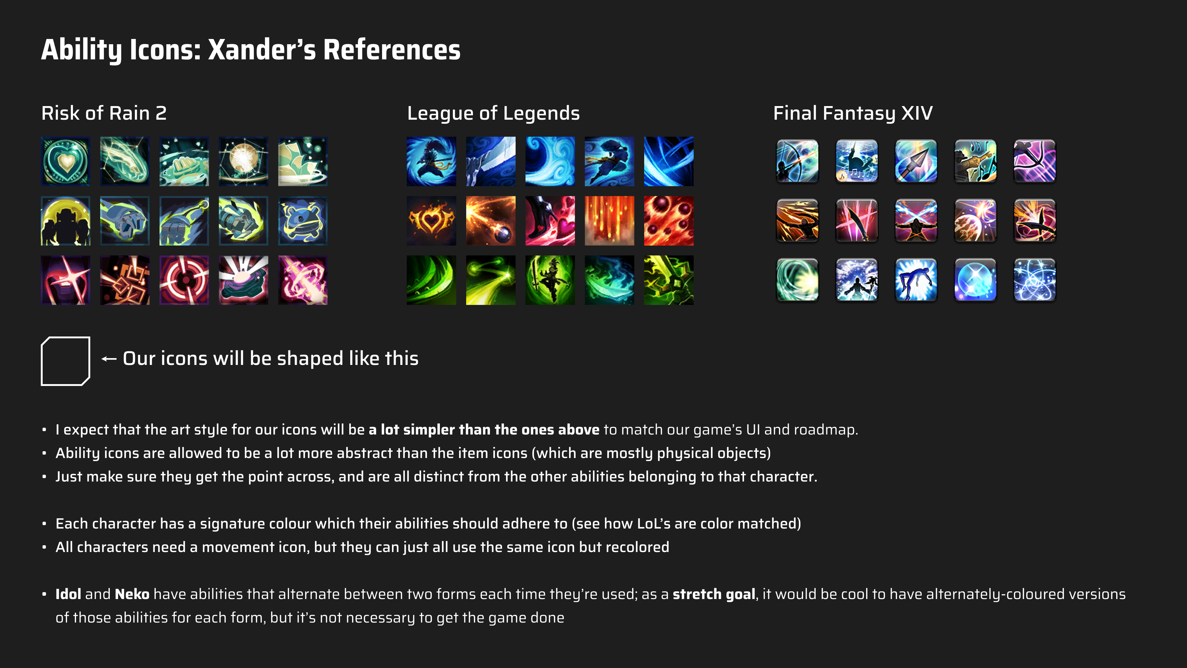 - Xander: “This ability copies all of the statuses on one unit to another unit. Way more abstract than the others, so the icon can also be more abstract; taking inspiration from mitosis would be a good bet.”