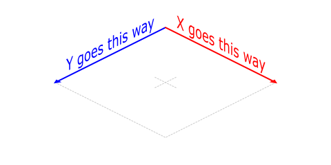 Essentially, despite being being viewed from a 45º angle, the grid’s data is still stored in a 2D array. The positive x-axis points to the bottom-right, and the positive y-axis points to the bottom left. The very top cell has coordinate (0, 0).