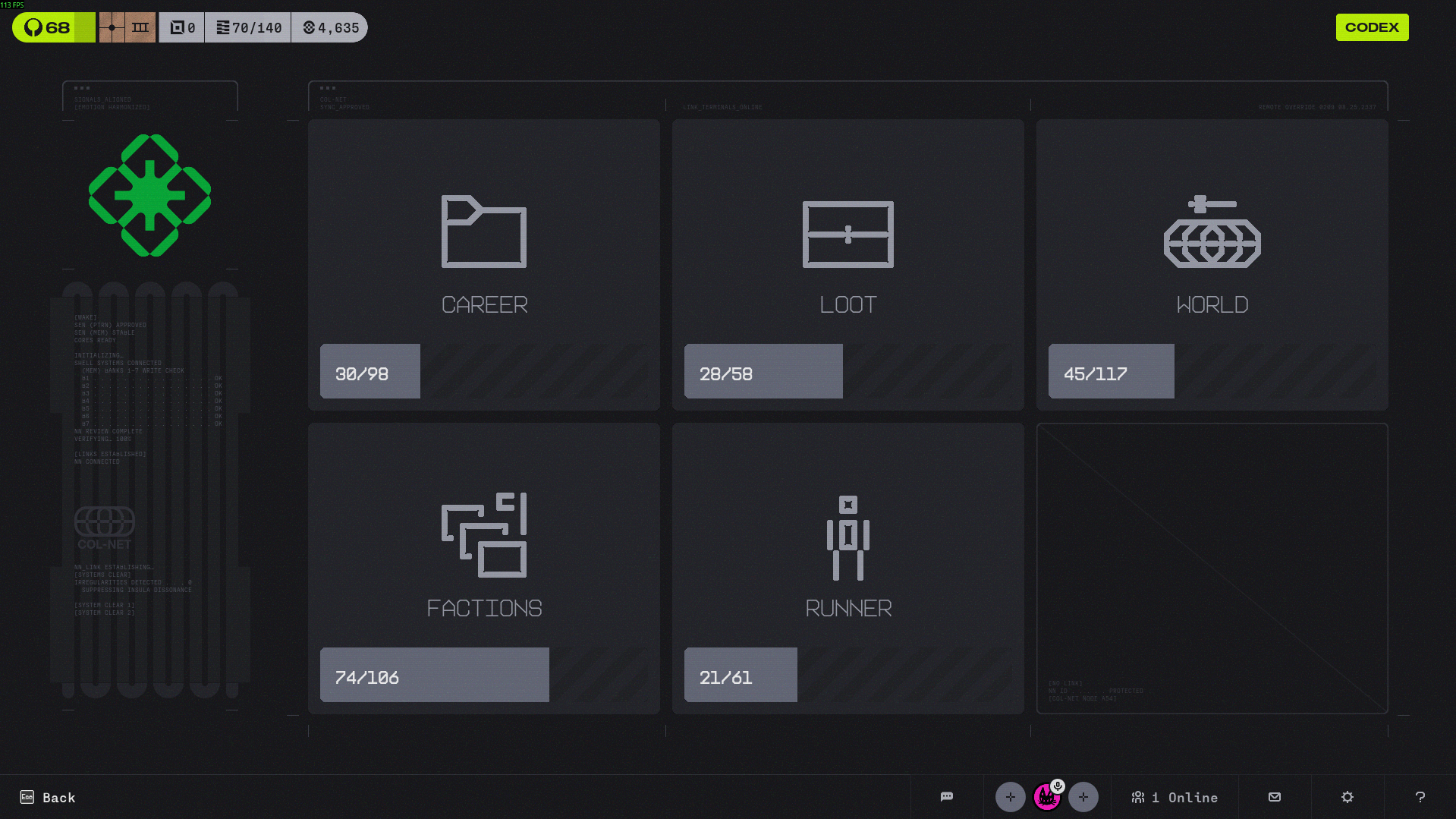 Entries in the Database menu are laid out in a grid. Before an entry is discovered, it is “encrypted”, shown as a black square with a question mark in the middle.