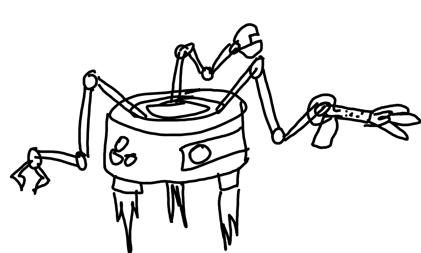 Hovers using thrusters. The machine has a long neck, its head is clad with numerous antennas while its face is covered by a wielding mask. The machine is painted white, and has several unpainted metal claws extending from different parts of its body. These claws hold a variety of tools, including a wielding torch, wrenches, screw drivers, etc.