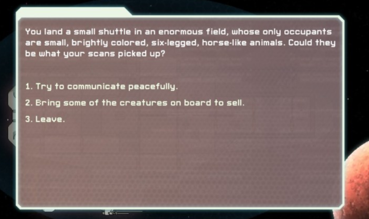 A dialogue section that describes the current situation that the player’s team faces. A dialogue bit should contain a list of selectable options that the player can choose from. After an option is selected, the text in the dialogue box get replaced with the new text from the next dialogue bit based on the option selected.