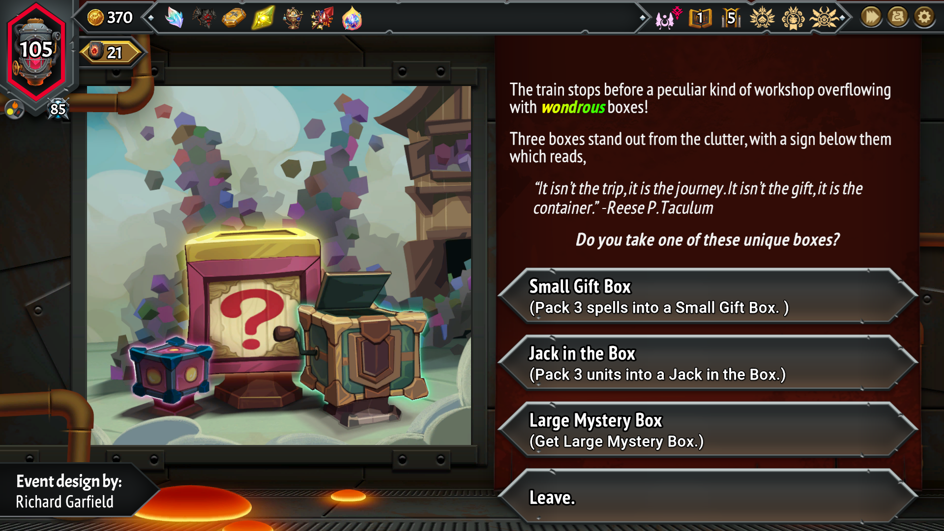 The system we are using here is based on the event rooms/random encounters present in Slay the Spire, FTL and Monster Train 2. Images of events in each of the games are shown below.