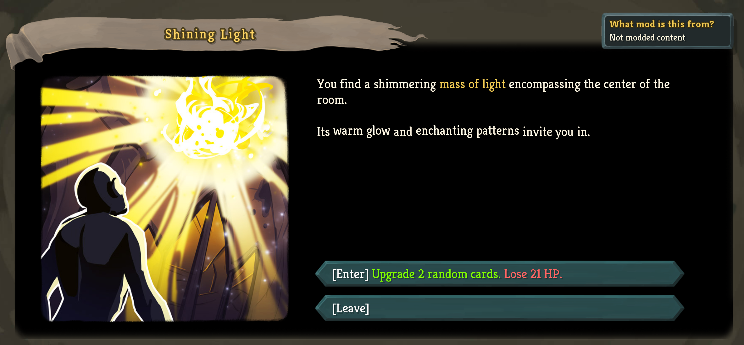 Every random encounter should contain a list of options that the player can choose from. Each option should have a title describing the choice they can make (example: Leave, Enter, etc) as well a description inform the player how the option will affect their run (example: Take Damage, Gain an item, etc).